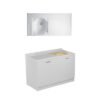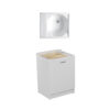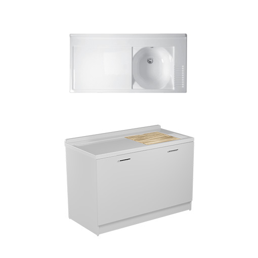 Supplied with a laundry basket (sliding and removable), solid wood washbasin table, methacrylate ABS sink complete with siphon and overflow, aluminum-colored handles.